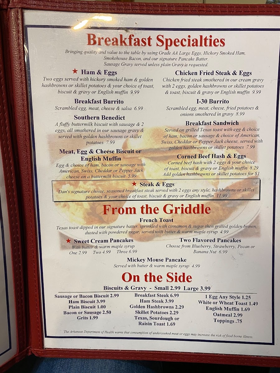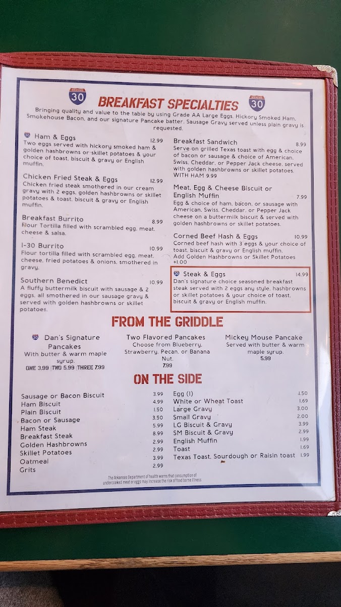 Reviews from diners emphasize the generous portions and the exceptional quality of ingredients—especially the renowned WRIGHTS bacon. The friendly service and cozy atmosphere create an inviting experience, making each visit feel like a warm embrace. Whether you're a local or just passing through, Dan's I-30 Diner is a must-visit for breakfast lovers!