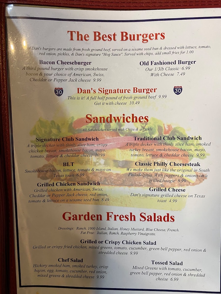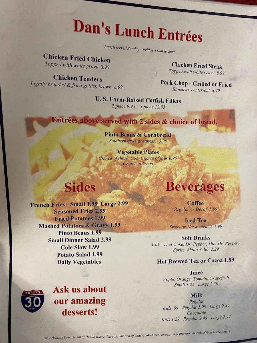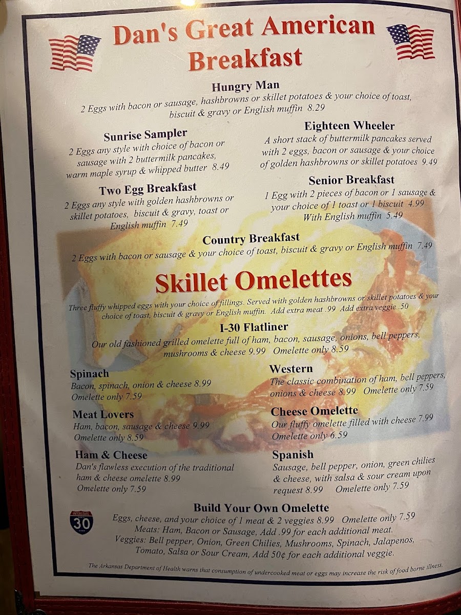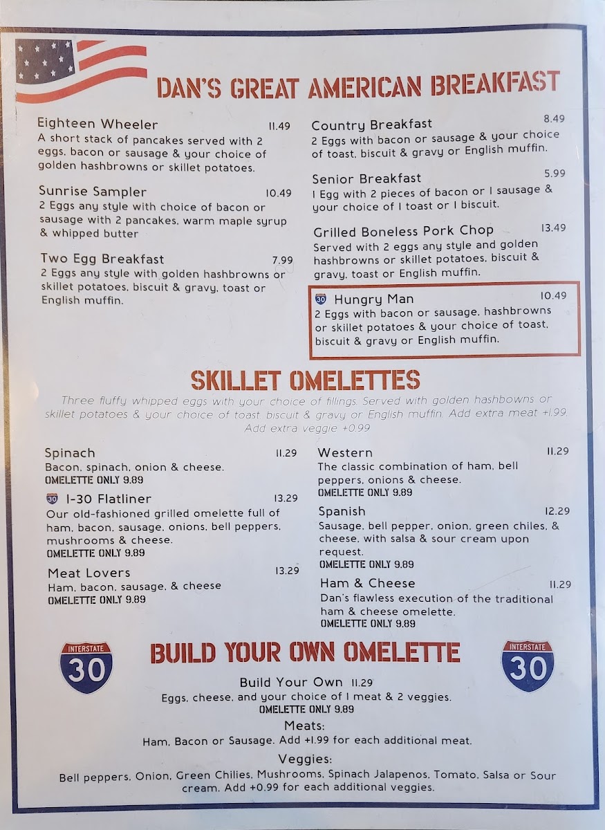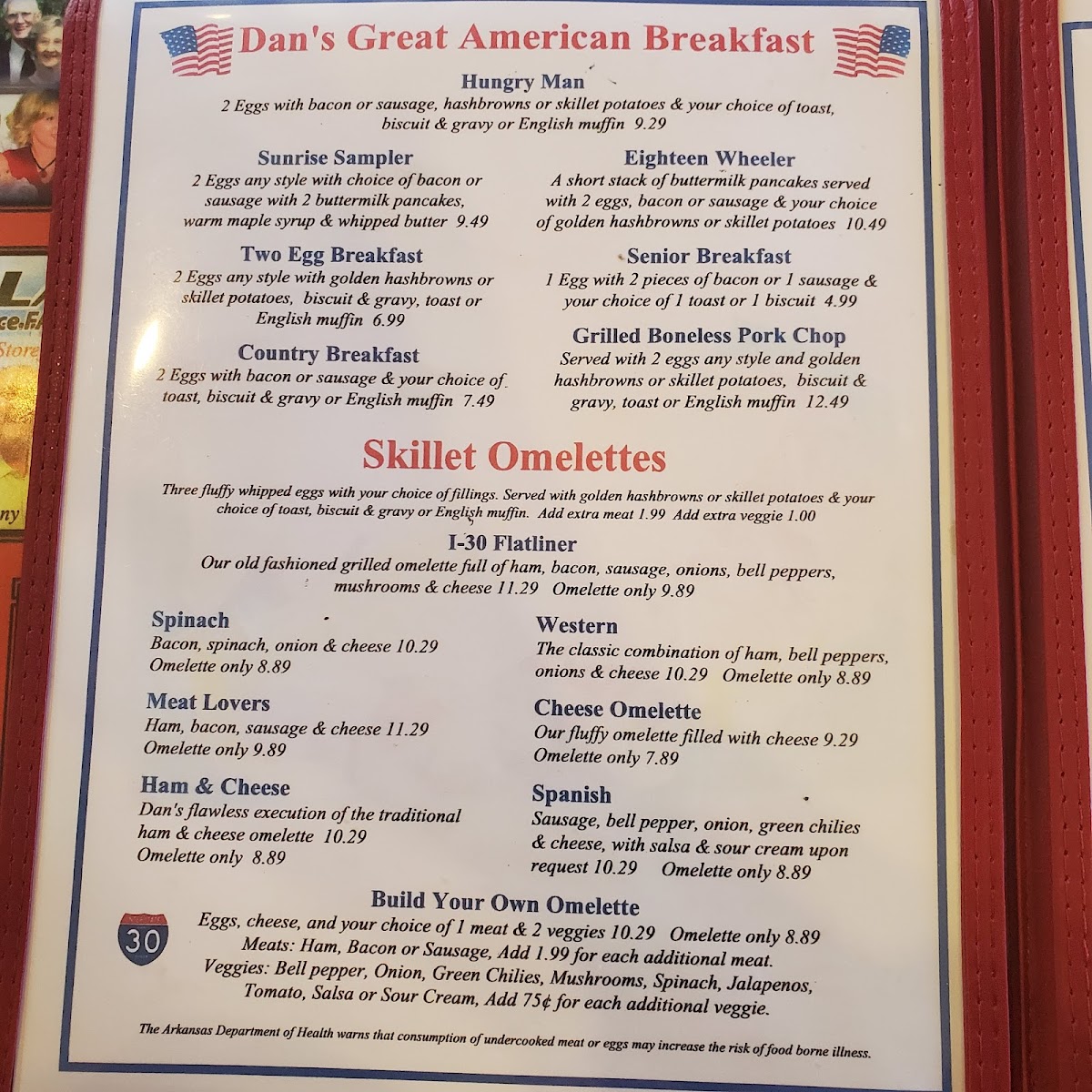 Welcome to Dan's I-30 Diner, a hidden gem located at 17018 I-30, Benton, AR. This diner offers a delightful blend of classic American breakfasts that are sure to satisfy any appetite. Highlights of the menu include the Hungry Man breakfast, featuring two eggs, crispy bacon or sausage, hearty hashbrowns, and your choice of toast, all for an unbeatable $7.29. For those with a sweeter tooth, the Sunrise Sampler serves fluffy buttermilk pancakes drizzled with warm maple syrup alongside perfectly cooked eggs and your choice of protein at just $7.49.